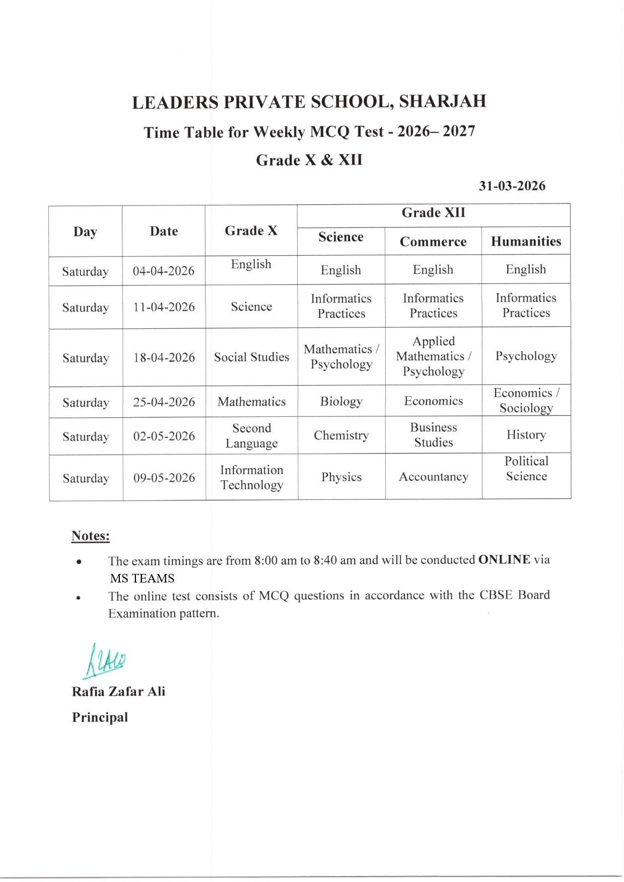 * * Datesheet for Weekly MCQ Test AY 2026-27 * *